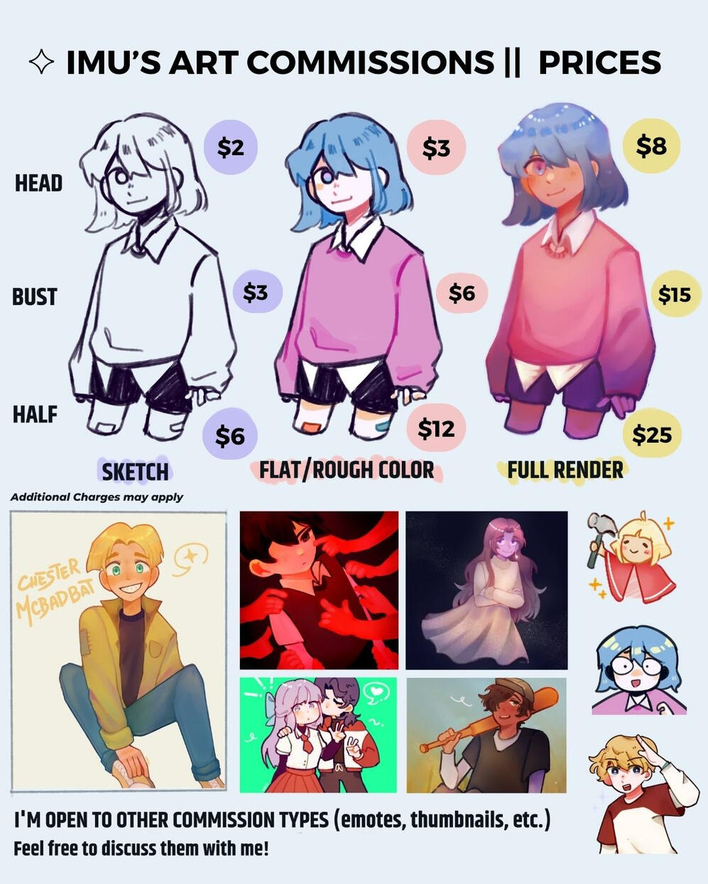 I'm open to other commission types such as emotes, Youtube thumbnails, discord stickers, etc.